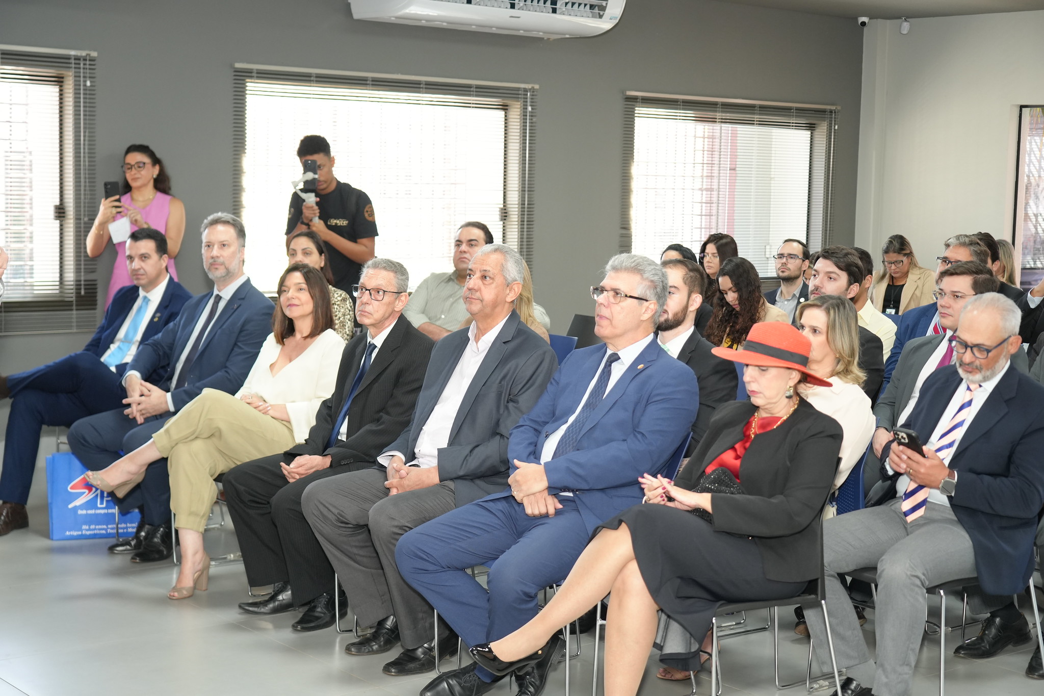 Várias pessoas sentadas em um auditório. Elas usam roupas formais.