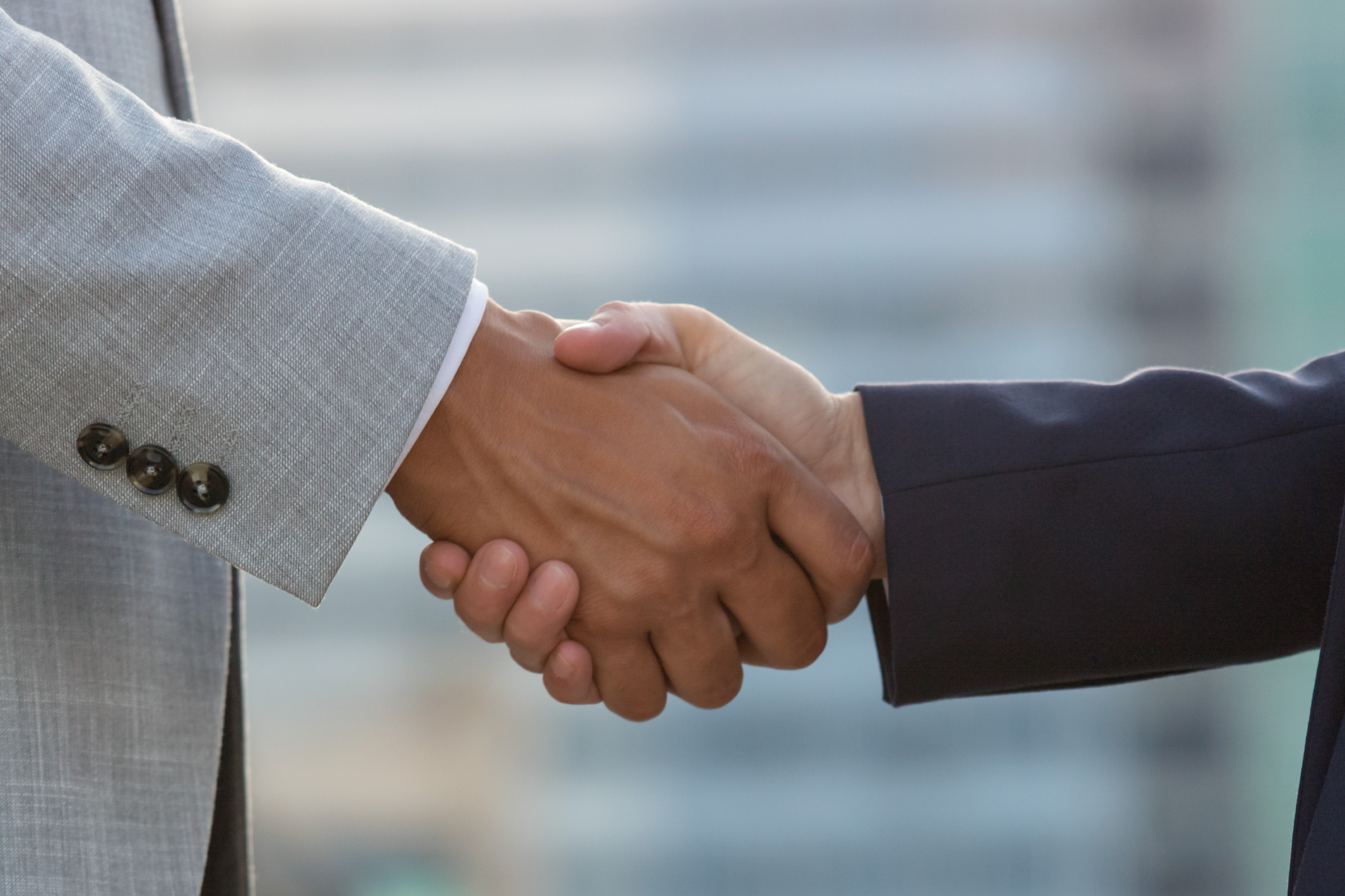 Imagem mostra um aperto de mãos entre duas pessoas.
